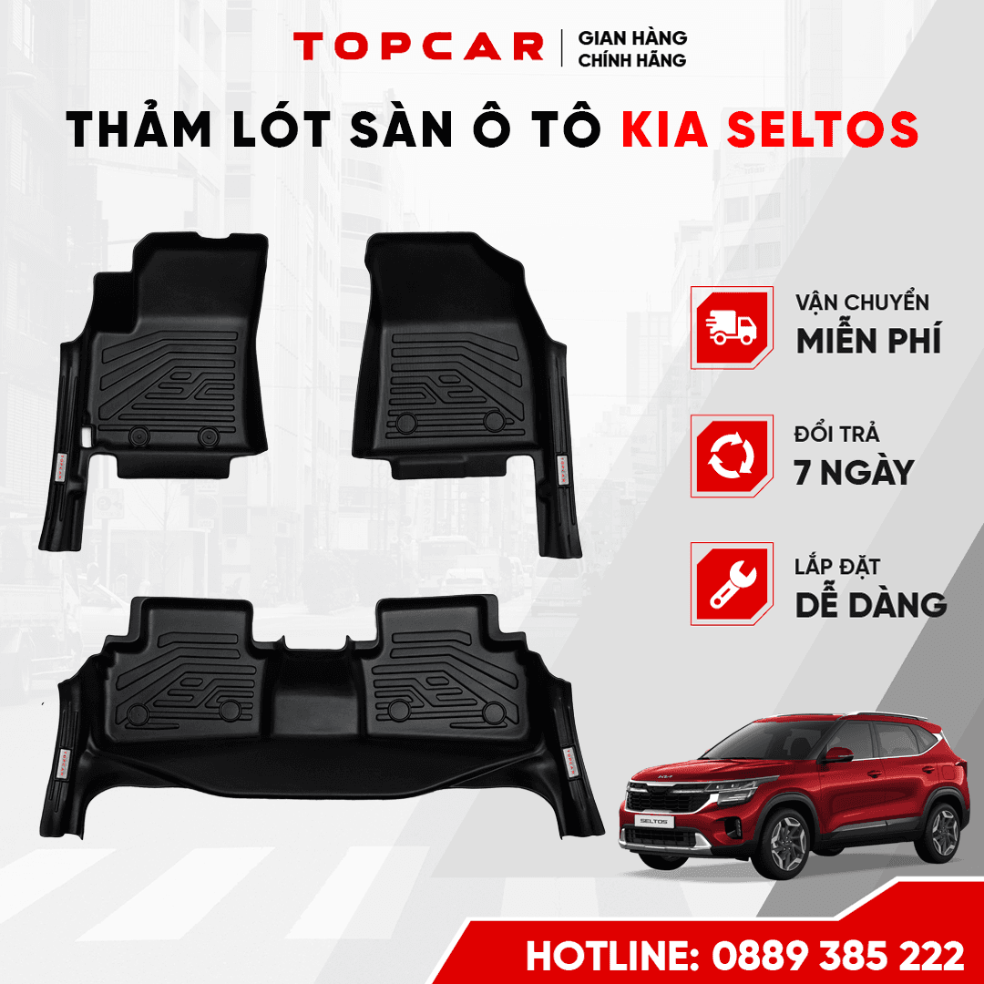 KIA Seltos là mẫu SUV đô thị nổi bật với kiểu dáng thể thao, động cơ tiết kiệm và không gian rộng rãi. Tuy nhiên, việc sử dụng xe thường xuyên khiến khu vực sàn dễ bị bám bẩn, ẩm mốc và trầy xước. Thảm lót sàn Topcar thiết kế riêng cho Seltos đời 2020–2025 được cắt may chuẩn xác theo sàn từng phiên bản, giúp phủ kín toàn bộ bề mặt và giữ cho nội thất luôn sạch sẽ như mới.